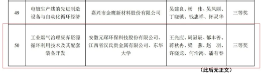 Anhui Yuanchen Environmental Protection Technology Co., Ltd. won the third prize for the project of "industrial flue gas treatment waste resource recycling technology and its supporting equipment development".