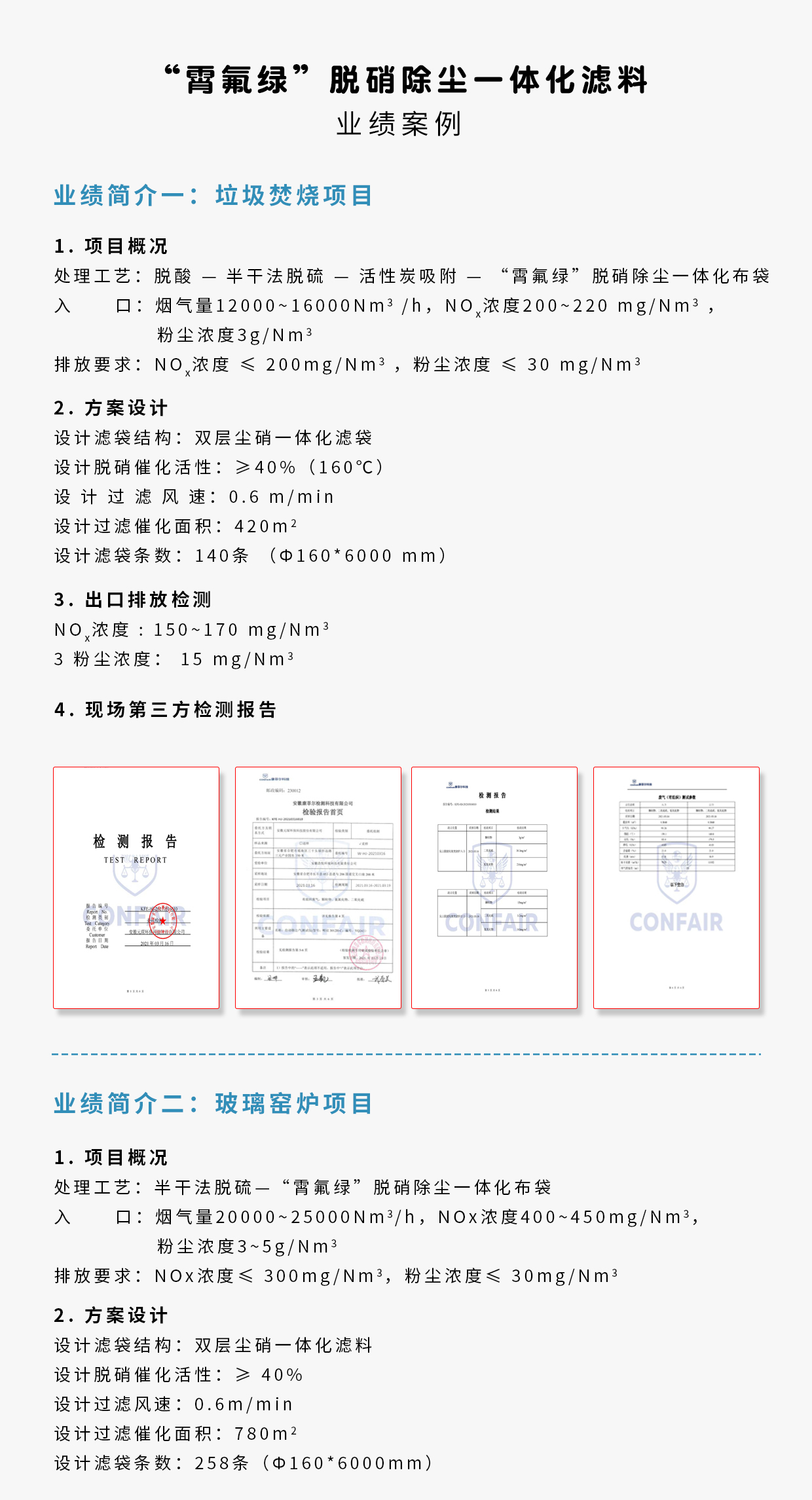 | 产品名称 | 除尘脱硝一体化单层滤料 | 除尘脱硝一体化双层滤料 | 除尘脱硝一体化覆膜滤料 | |